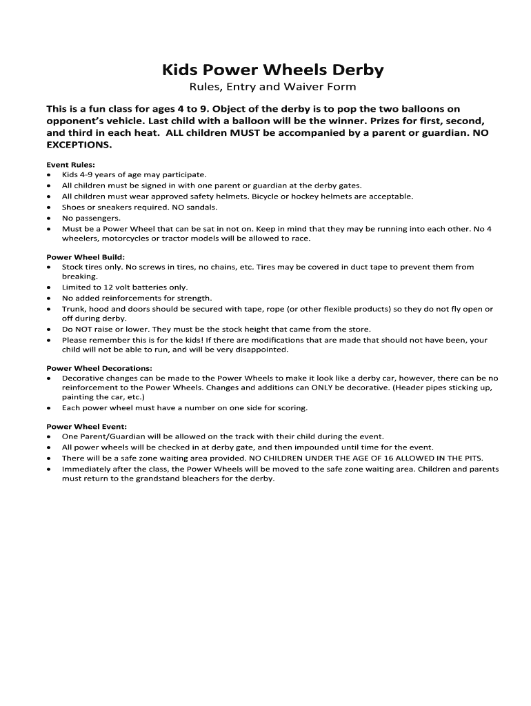 Kids Power Wheels Derby Rules, Entry and Waiver Form This is a fun class for ages 4 to 9. Object of the derby is to pop the two balloons on opponents' vehicle. Last child with a balloon will be the