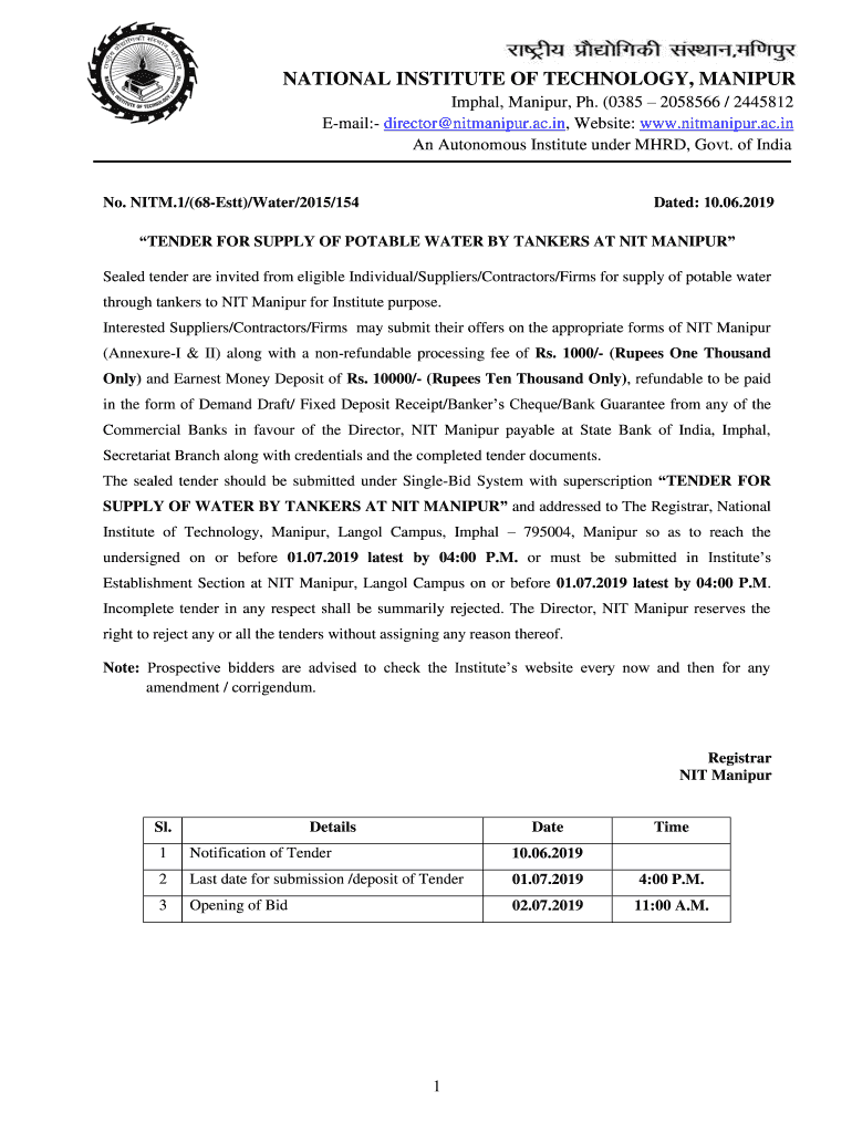 Get the free tender document for supply of Potable water by tankers at NIT Manipur.
