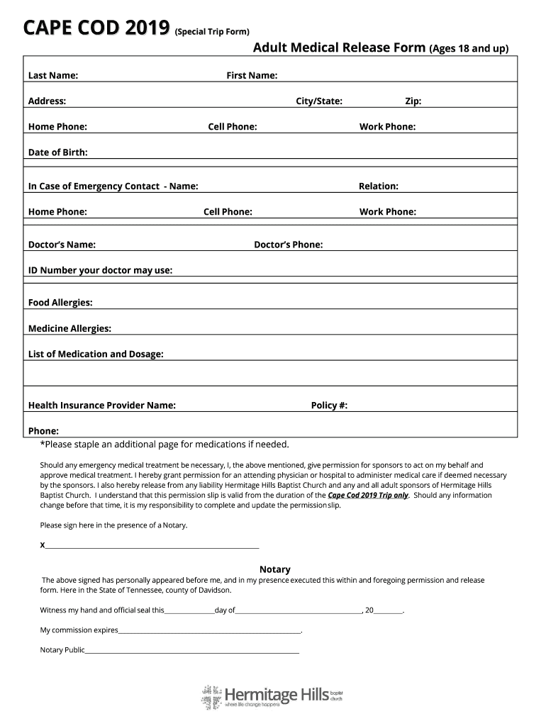 CAPE COD 2019 (Special Trip Form) Last Name:Adult Medical Release Form (Ages 18 and up)First Name:Address: Home Phone:City/State: Cell Phone:Zip: Work Phone:Date of Birth: In Case of Emergency Contact