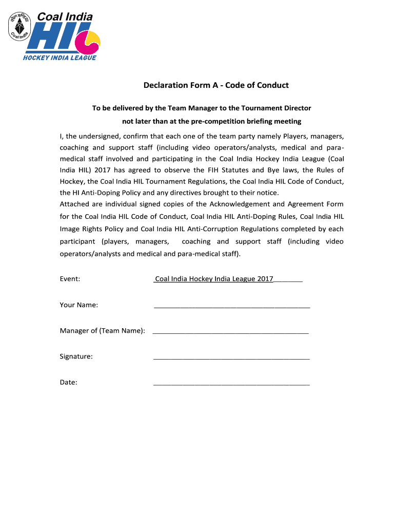 Declaration Form A Code of Conduct To be delivered by the Team Manager to the Tournament Director not later than at the competition briefing meeting I, the undersigned, confirm that each one of the