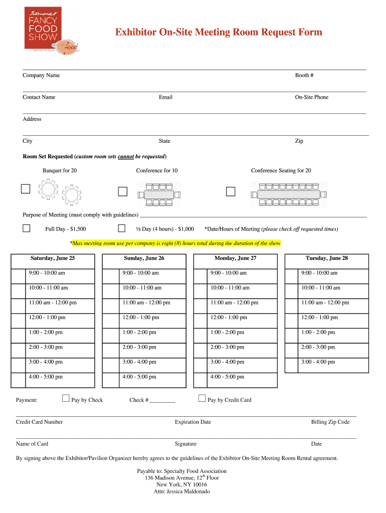 Exhibitor Onsite Meeting Room Request Form Company Name Booth # Contact Name Email Onsite Phone Address City State Zip Room Set Requested (custom room sets cannot be requested) Banquet for 20Conference