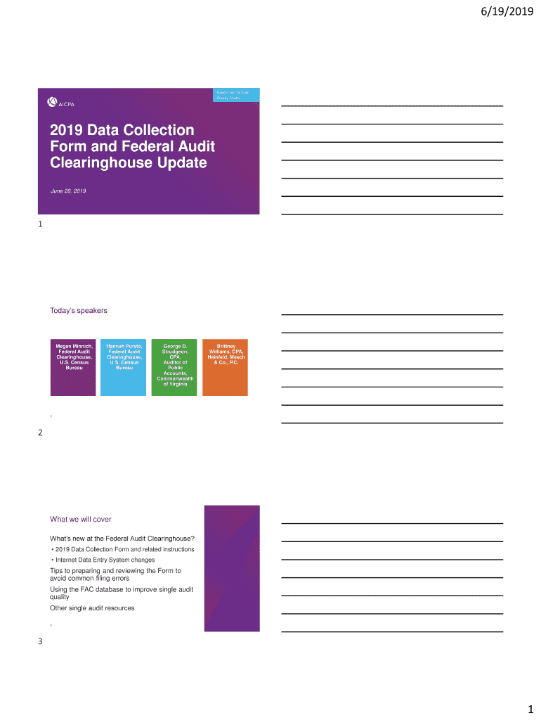 6/19/2019Governmental Audit Quality Center2019 Data Collection Form and Federal Audit Clearinghouse Update June 20, 20191Todays speakers Megan Finnish, Federal Audit Clearinghouse, U.S. Census Bureau