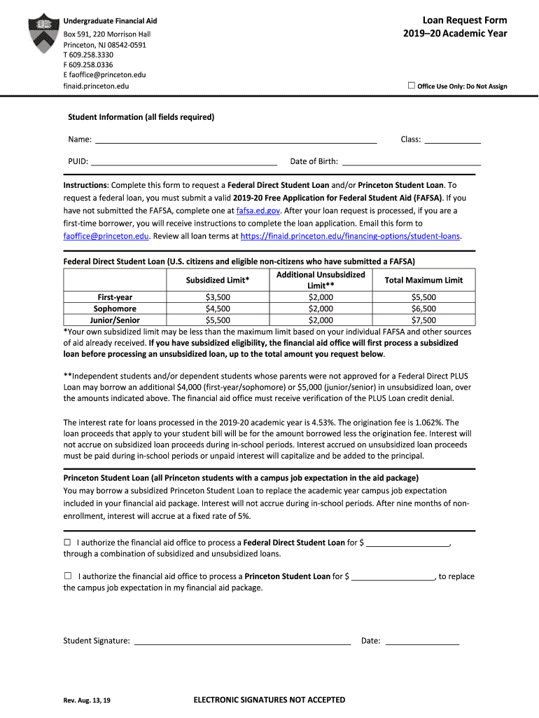 Loan Request Form 201920 Academic YearUndergraduate Financial Aid Box 591, 220 Morrison Hall Princeton, NJ 085420591 T 609.258.3330 F 609.258.0336 E fa office Princeton.edu fin aid.Princeton.edu Office