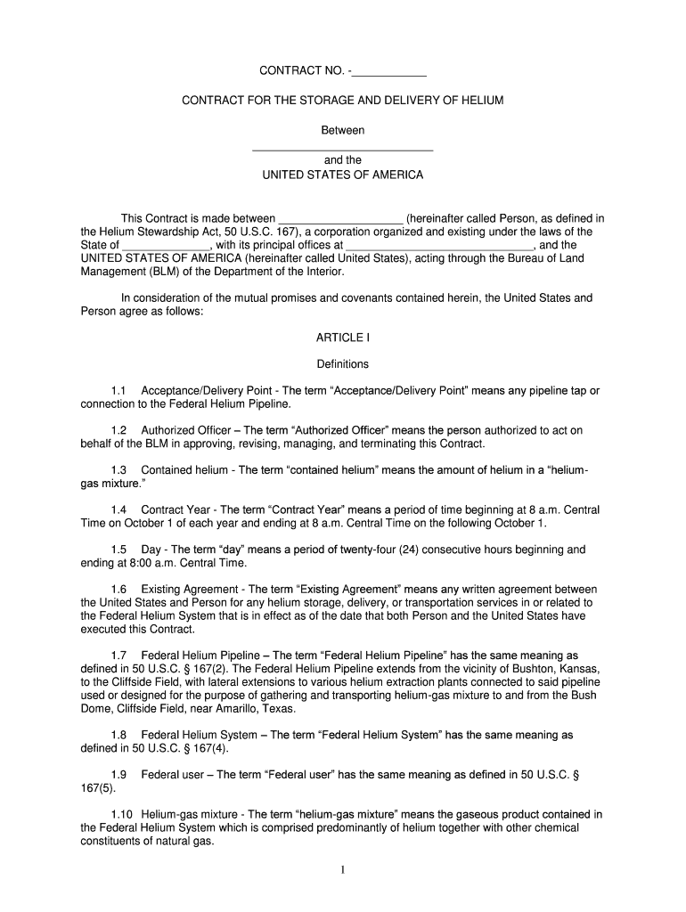 CONTRACT NO. CONTRACT FOR THE STORAGE AND DELIVERY OF HELIUM Between and the UNITED STATES OF Americans Contract is made between (hereinafter called Person, as defined in the Helium Stewardship Act,