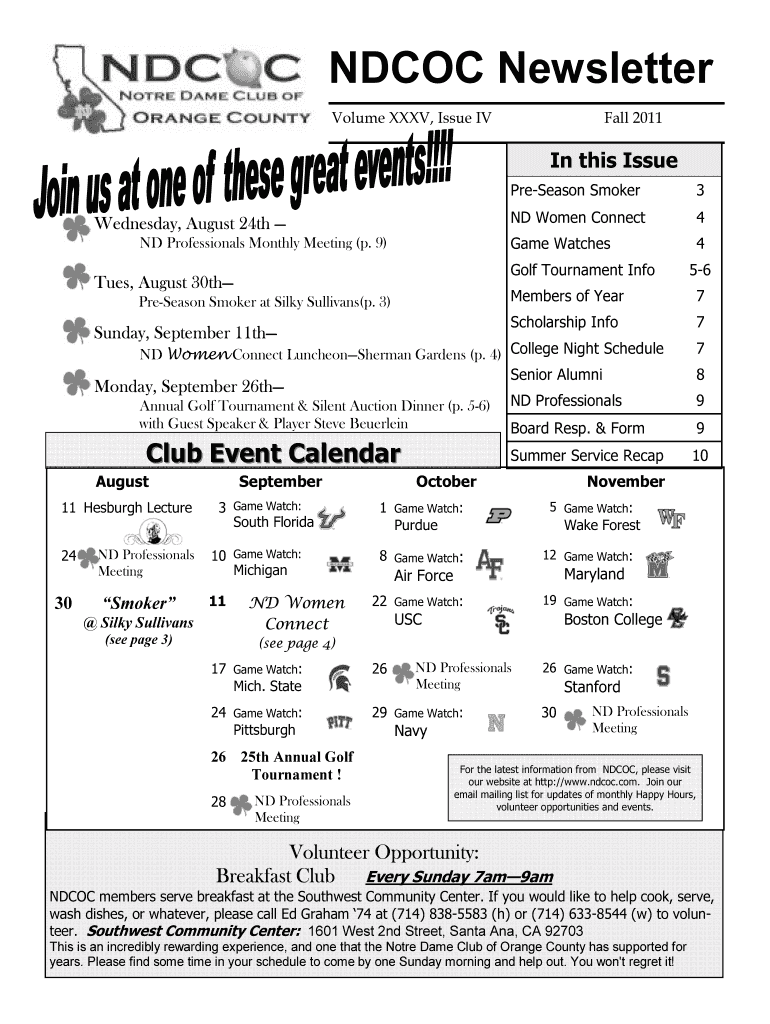 ND COC Newsletter Volume XXXV, Issue IVF all 2011In this Issue Wednesday, August 24th ND Professionals Monthly Meeting (p. 9)Preseason Smoker3ND Women Connect4Game Watches4Golf Tournament Info Tues,