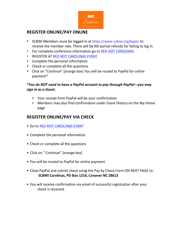 REGISTER ONLINE/PAY ONLINE SCBWI Members must be logged in at https://www.scbwi.org/login/ to receive the member rate. There will be NO partial refunds for failing to log in. For complete conference