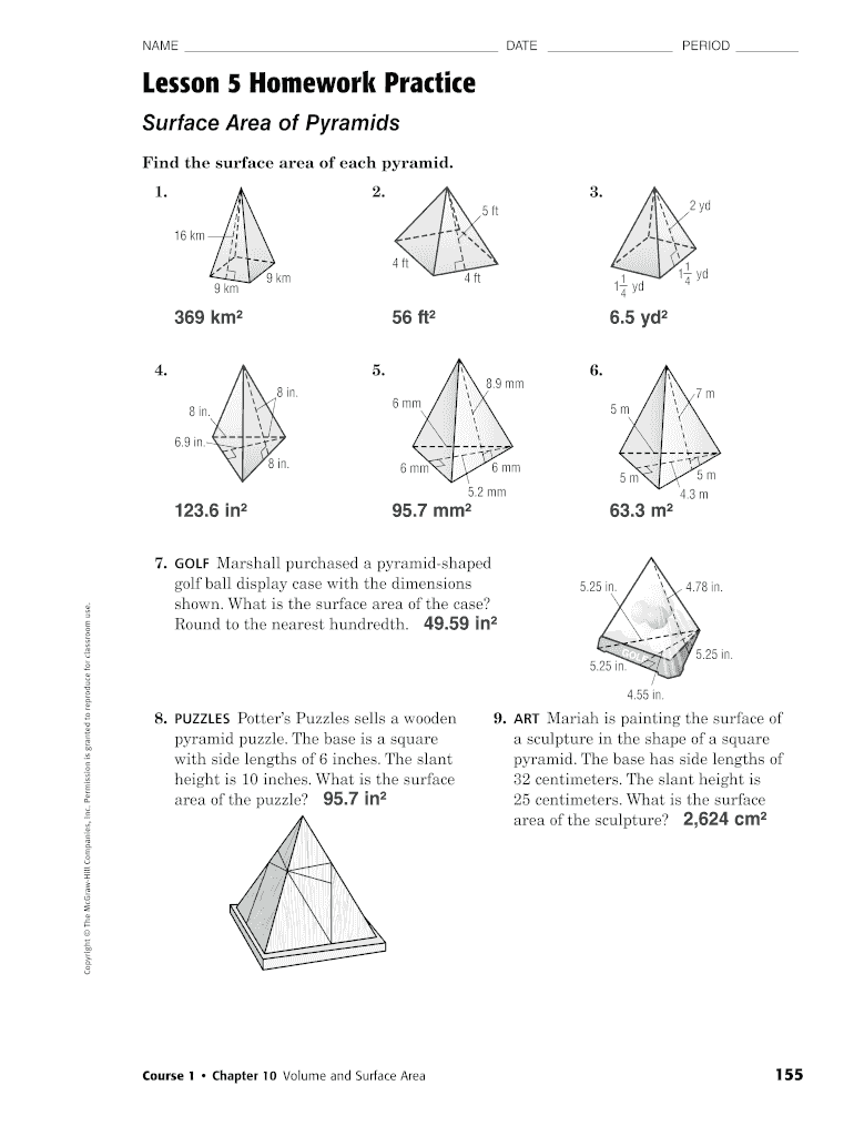 NAME DATE PERIOD Lesson 5 Homework Practice Surface Area of Pyramids Find the surface area of each pyramid. 1.2.3.2 yd5 ft 16 km9 km4 ft9 km369 km4 ft1 1 yd 456 ft4. 8 in.1 yd 46.5 yd5. 8 in.18.9