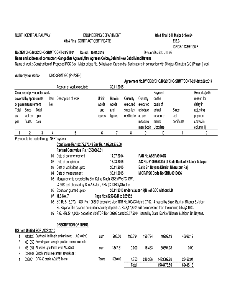 4th & final bill Major BR. No.64 E.B.3 IGRCE1235/E 195 F No.XEN/DHO/R/GC/DHOSRMT/CONT02/Bill/04 Dated: 15.01.2016 Division/District: Jhansi Name and address of contractor: Kandahar Agrawal, New Agra