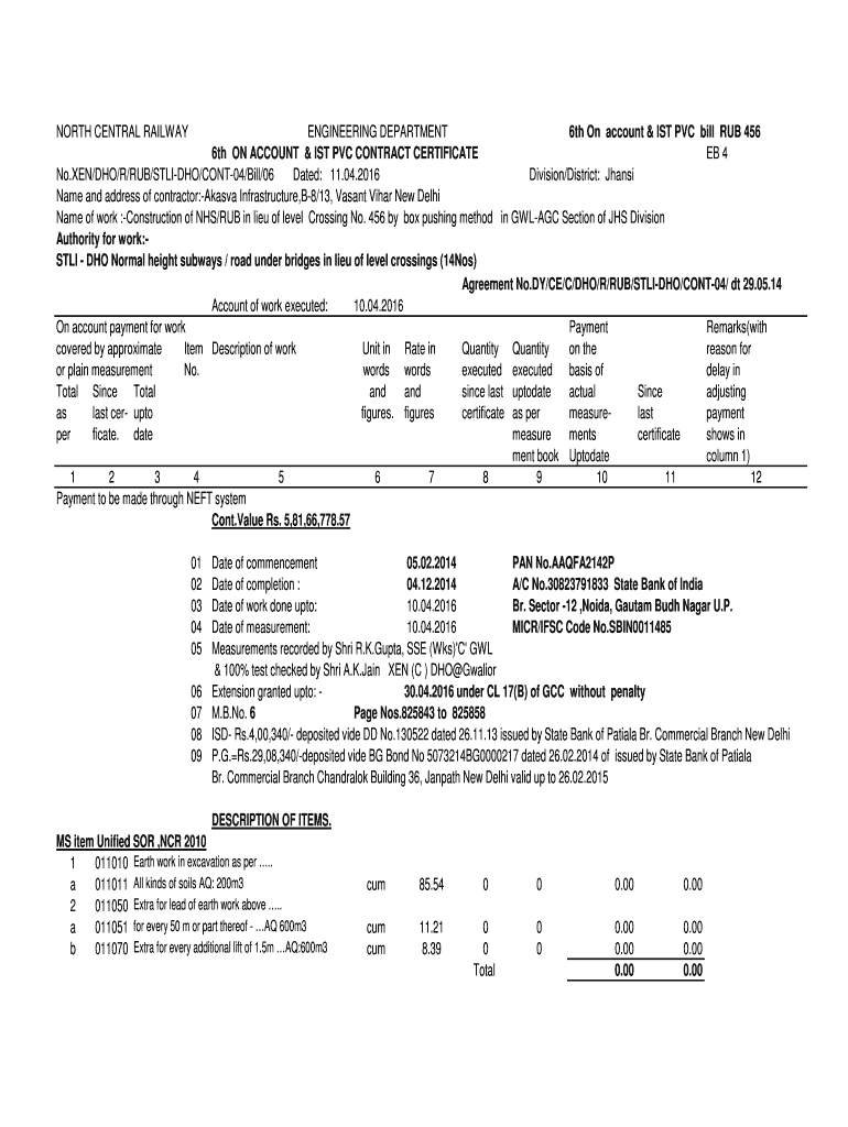ENGINEERING DEPARTMENT 6th On account & IST PVC bill RUB 456 6th ON ACCOUNT & IST PVC CONTRACT CERTIFICATE EX 4 No.XEN/DHO/R/RUB/STLIDHO/CONT04/Bill/06 Dated: 11.04.2016 Division/District: Jhansi
