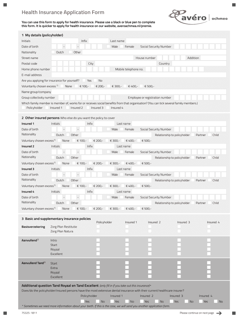You can use this form to apply for health insurance. Please use a black or blue pen to complete