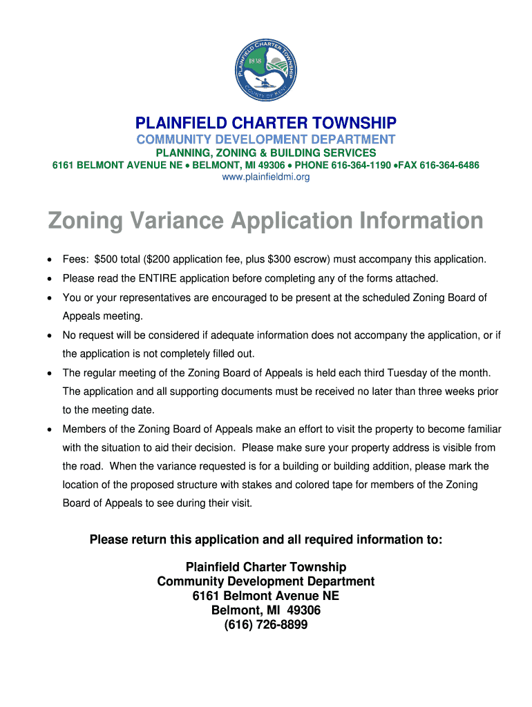 Zoning variance application information is a set of documents and details required to request a variance from the zoning regulations for a property.
