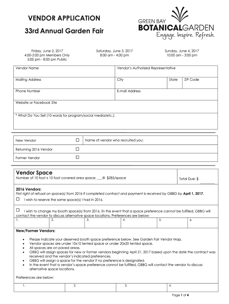 VENDOR APPLICATION 33rd Annual Garden Fair Friday, June 2, 2017 4:005:00 pm Members Only 5:00 pm 8:00 pm Public Saturday, June 3, 2017 8:00 am 4:00 pm Sunday, June 4, 2017 10:00 am 3:00 vendor NameVendors