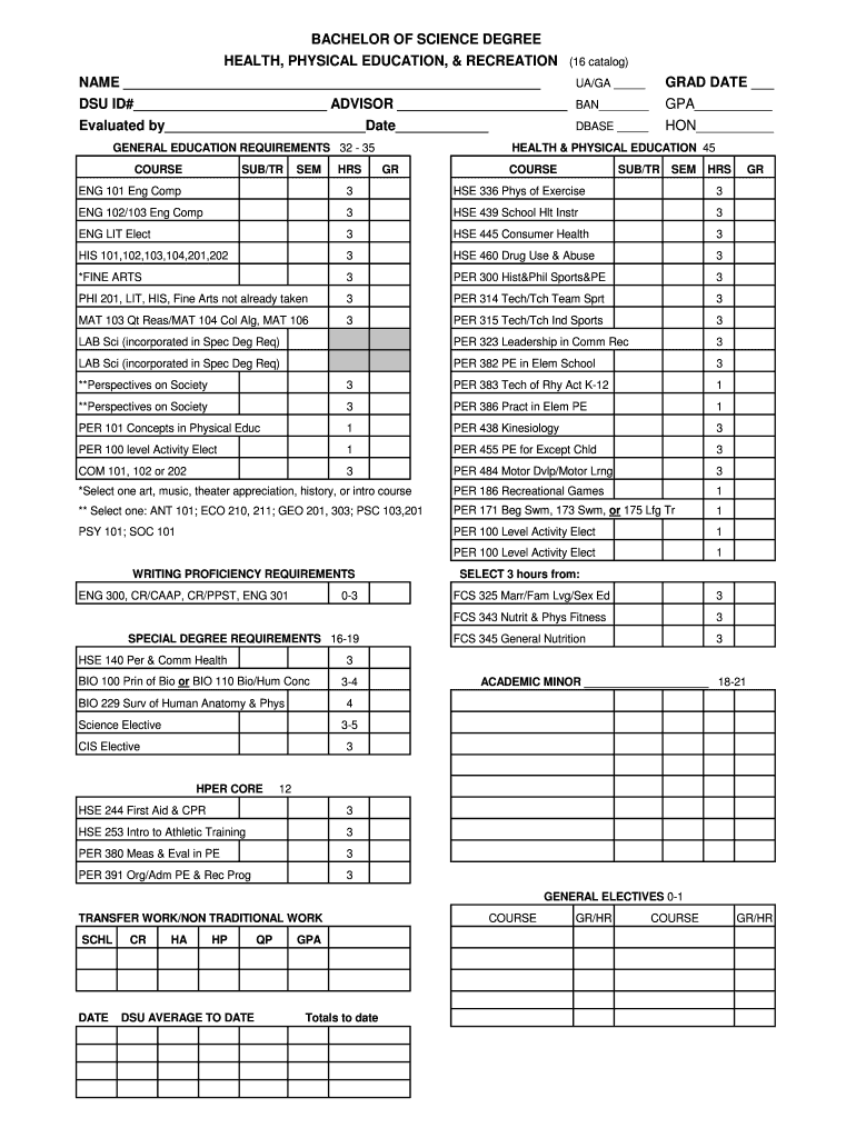 BACHELOR OF SCIENCE DEGREE HEALTH, PHYSICAL EDUCATION, & RECREATION (16 catalog) NAME GRAD DATE UA/GA DSU ID# ADVISOR BAN GPA Evaluated by Date HON GENERAL EDUCATION REQUIREMENTS 32 35 COURSES/TRSEMHRSDBASE