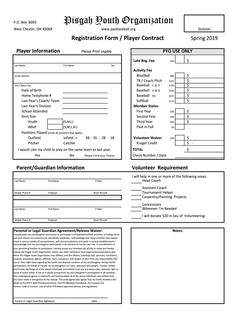 Pisa Youth Organization. O. Box 8093 West Chester, OH 45069www.baseball.orgDivisionRegistration Form / Player Contracting 2019Player Information USE ONLYPlease Print Legibly Late Reg. Feast NameFirst