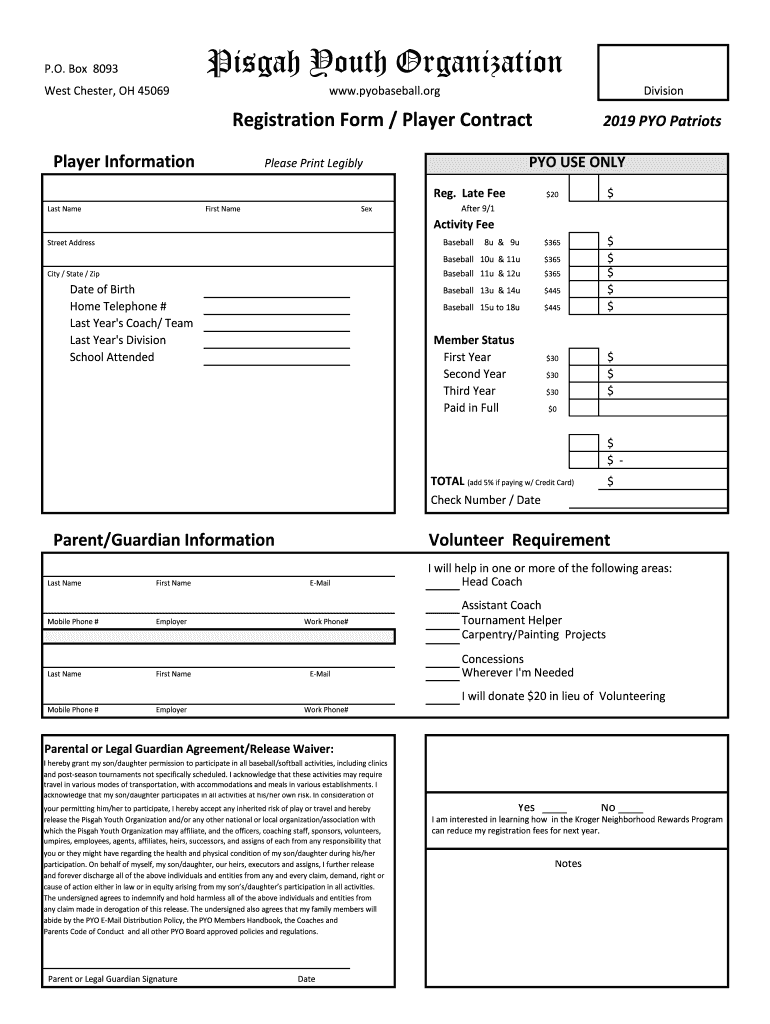 Pisa Youth Organization. O. Box 8093 West Chester, OH 45069www.baseball.orgDivisionRegistration Form / Player Contract2019 PRO PatriotsPlayer Information USE ONLYPlease Print Legibly Reg. Late Feast