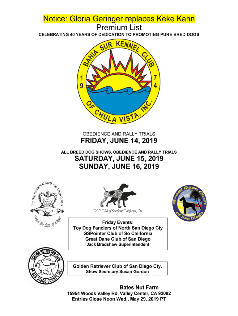 Premium ListCELEBRATING 40 YEARS OF DEDICATION TO PROMOTING PURE BRED DISOBEDIENCE AND RALLY TRIALSFRIDAY, JUNE 14, 2019,