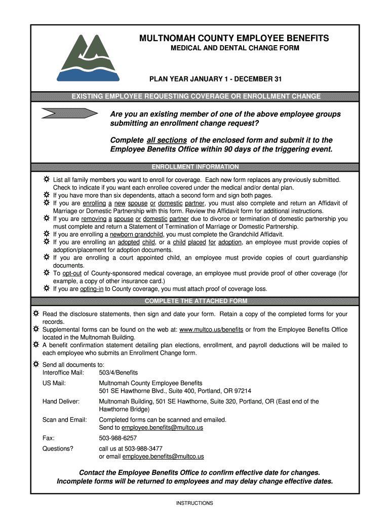 MULTNOMAH COUNTY EMPLOYEE BENEFITS MEDICAL AND DENTAL CHANGE FORMULA YEAR JANUARY 1 DECEMBER 31 EXISTING EMPLOYEE REQUESTING COVERAGE OR ENROLLMENT Changeable you an existing member of one of the