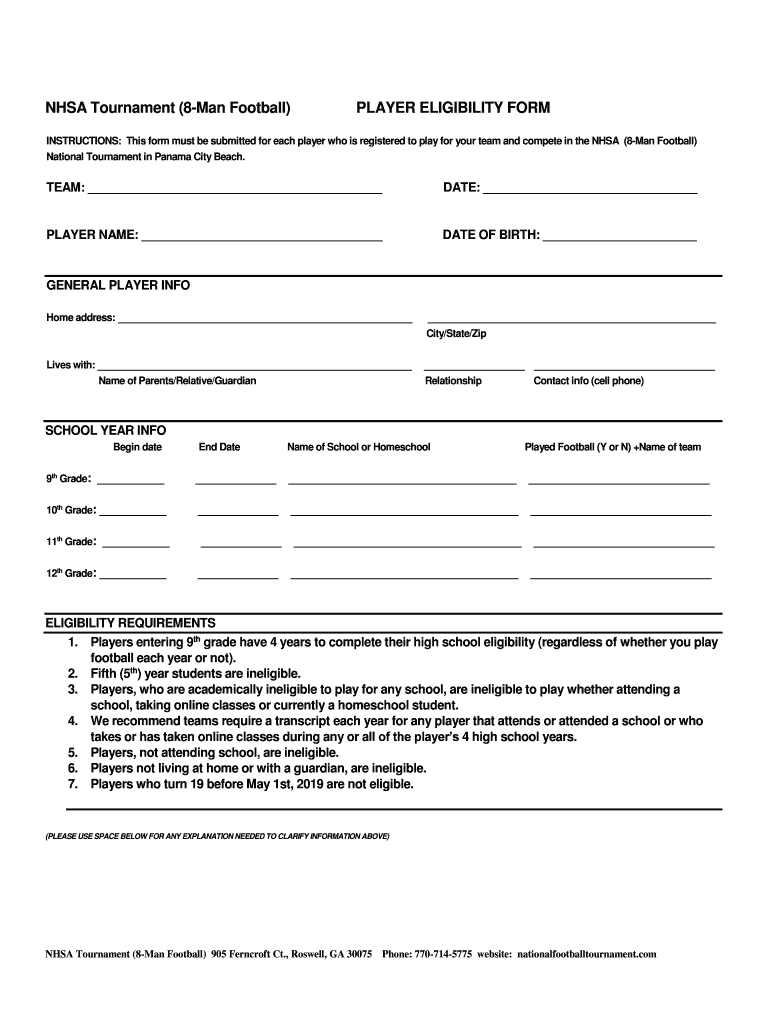 Get the free NHSA Tournament (8-Man Football) PLAYER ELIGIBILITY FORM