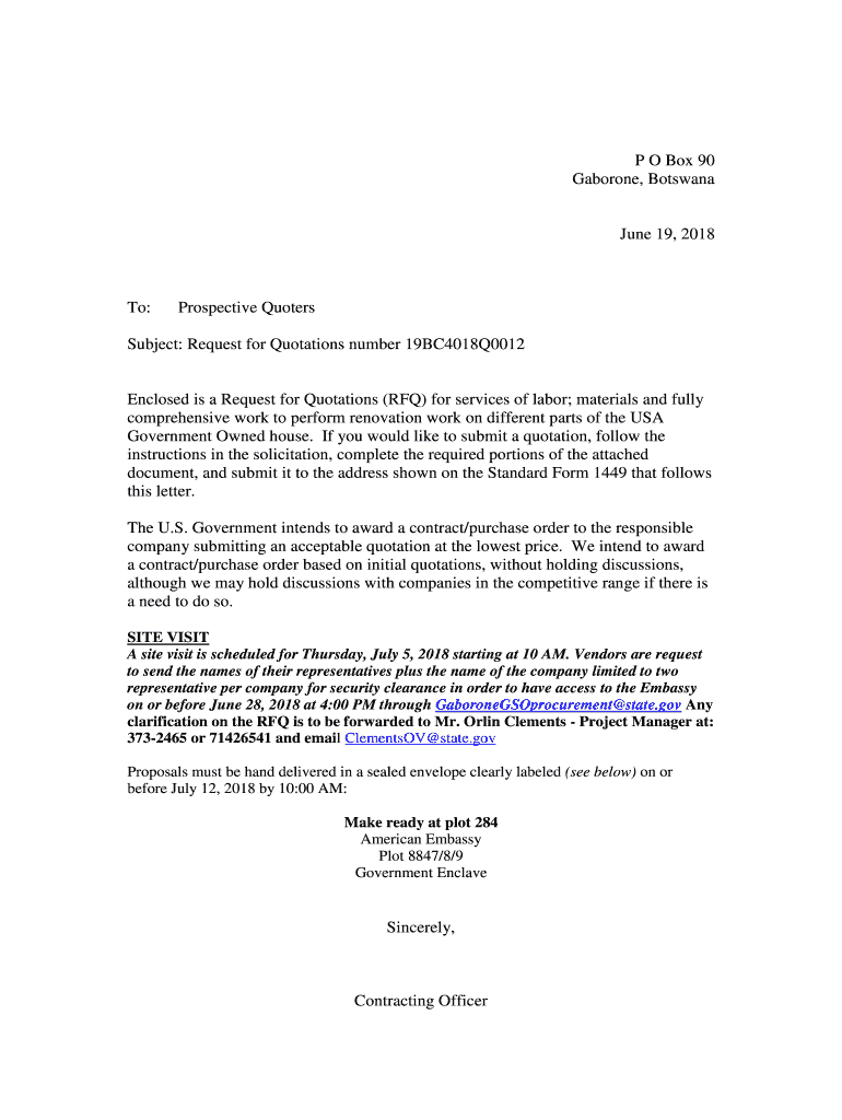Gaborone, Botswana June 19, 2018To:Prospective QuotersSubject: Request for Quotations number 19BC4018Q0012Enclosed is a Request for Quotations (RFQ) for services of labor; materials and