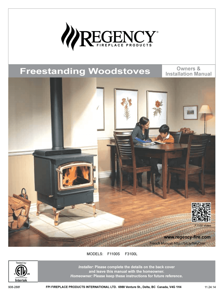 Freestanding WoodstovesOwners & Installation ManualF1100 Video.regencyfire.com French Manual: http://bit.ly/N4yDmr MODELS: Tested by:908288fF1100SF3100LInstaller: Please complete the details on the