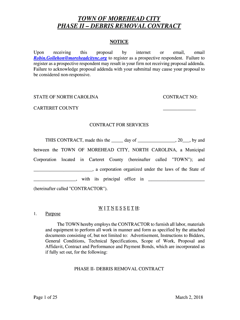 TOWN OF FOREHEAD CITY PHASE II DEBRIS REMOVAL CONTRACT NOTICE Upon receiving this proposal by internet or email, email Robin. Galleon moreheadcitync.org to register as a prospective respondent. Failure