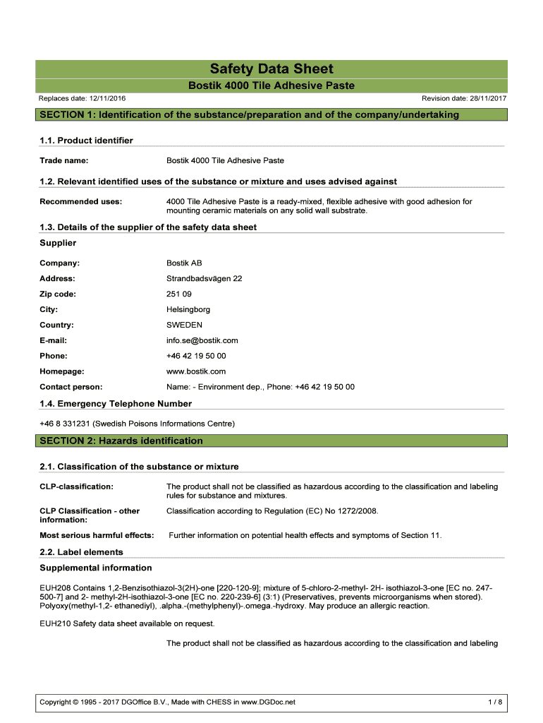 Replaces date: 12/11/2016Revision date: 28/11/2017SECTION 1: Identification of the substance/preparation and of the company/undertaking