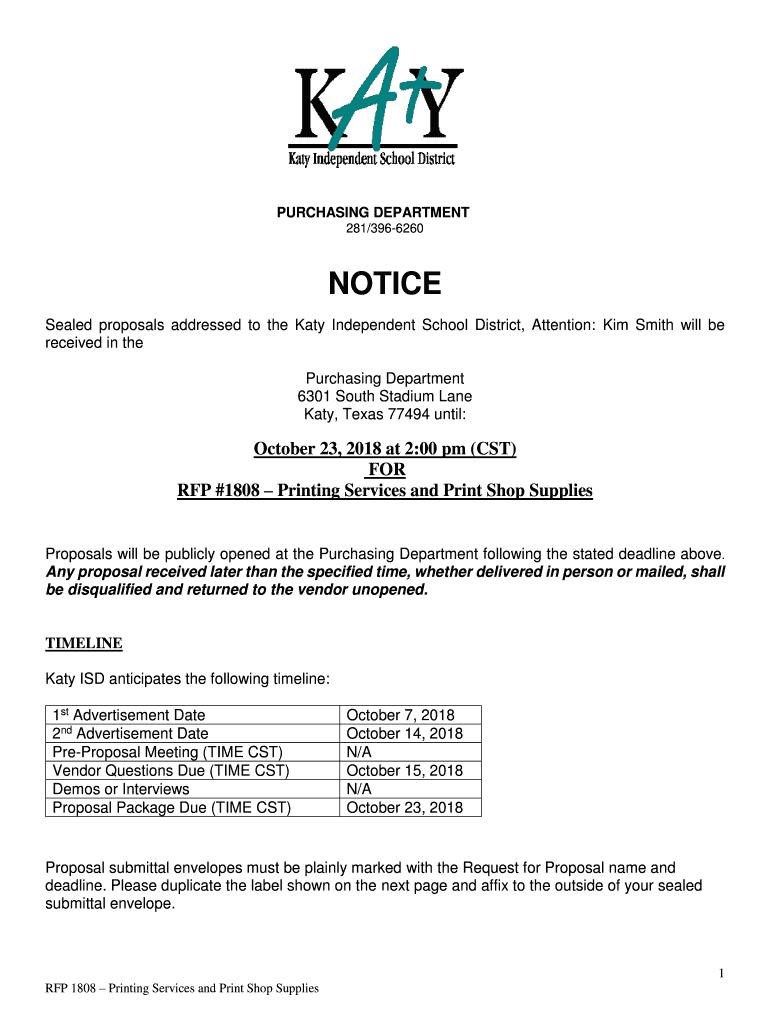 PURCHASING DEPARTMENT 281/3966260NOTICE Sealed proposals addressed to the Katy Independent School District, Attention: Kim Smith will be received in the Purchasing Department 6301 South Stadium Lane