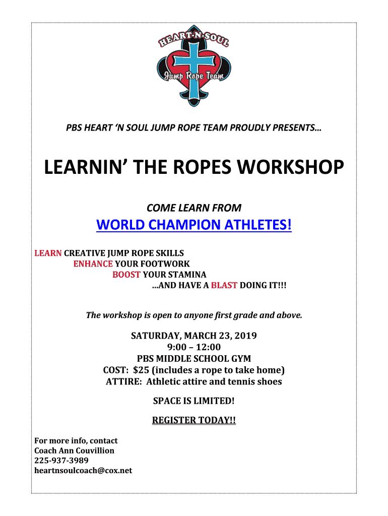 PBS HEART N SOUL JUMP ROPE TEAM PROUDLY PRESENTSLEARNIN THE ROPES WORKSHOP COME LEARN DREAMWORLD CHAMPION ATHLETES! LEARN CREATIVE JUMP ROPE SKILLS ENHANCE YOUR FOOTWORK BOOST YOUR STAMINA AND HAVE