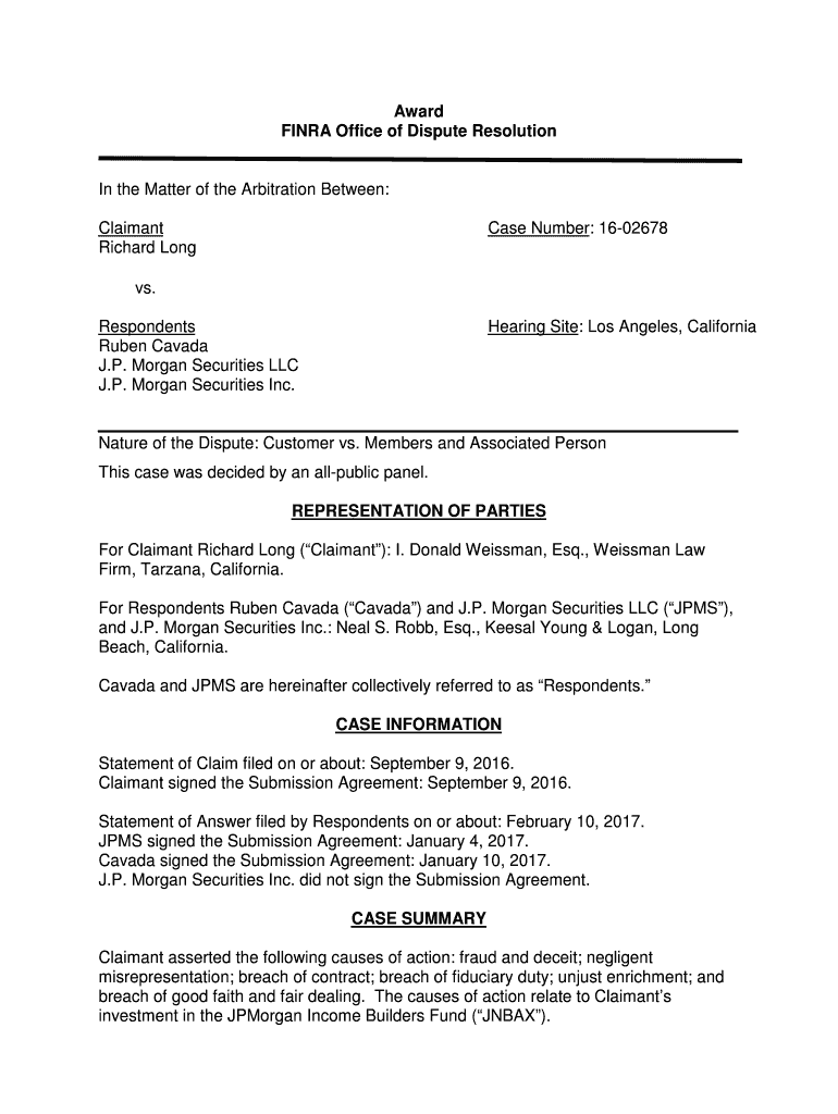 Award FINRA Office of Dispute Resolution In the Matter of the Arbitration Between: Claimant Richard Long Case Number: 1602678vs. Respondents Ruben Canada J.P. Morgan Securities LLC J.P. Morgan Securities