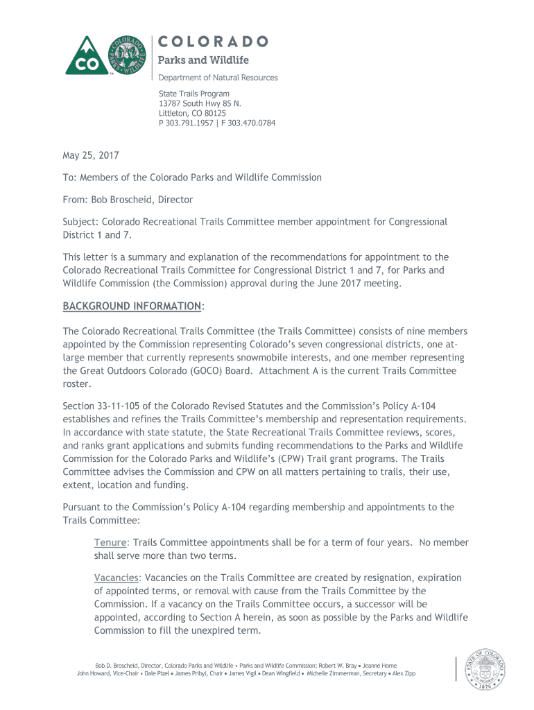 State Trails Program 13787 South Hwy 85 N. Littleton, CO 80125 P 303.791.1957 F 303.470.0784May 25, 2017 To: Members of the Colorado Parks and Wildlife Commission From: Bob Broached, Director Subject: