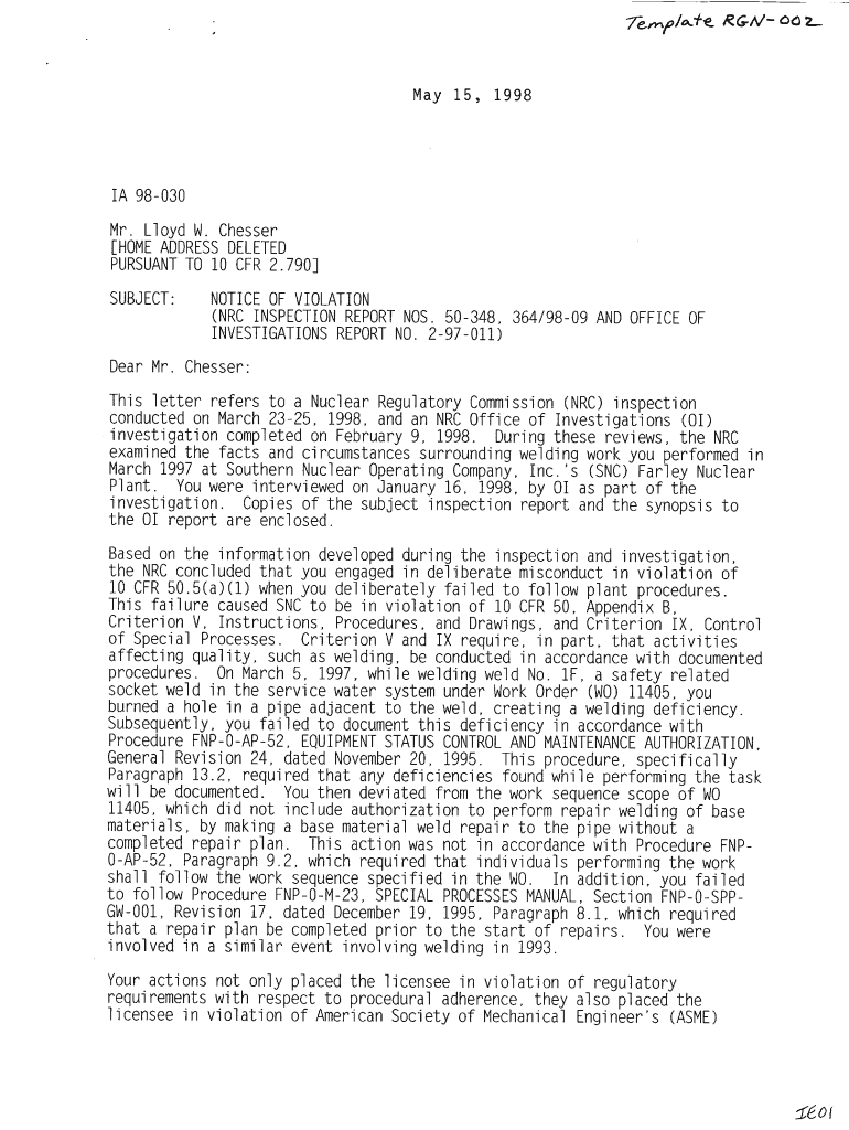 Get the free NOTICE OF VIOLATION (NRC INSPECTION REPORT NOS. 50-348, 364/98-09 AND OFFICE OF INVE...