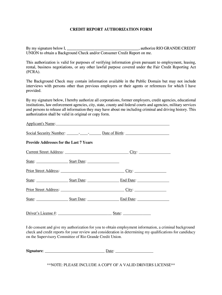 Get the free Credit Report Authorization Form - riograndecu.org
