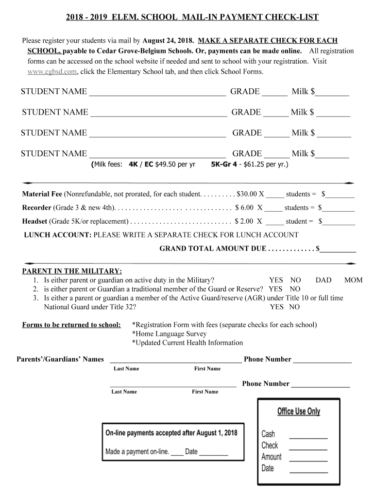 2018 2019 ELEM. SCHOOL MAILING PAYMENT CHECKLIST Please register your students via mail by August 24, 2018. MAKE A SEPARATE CHECK FOR EACH SCHOOL, payable to Cedar Grove Belgium Schools. Or, payments