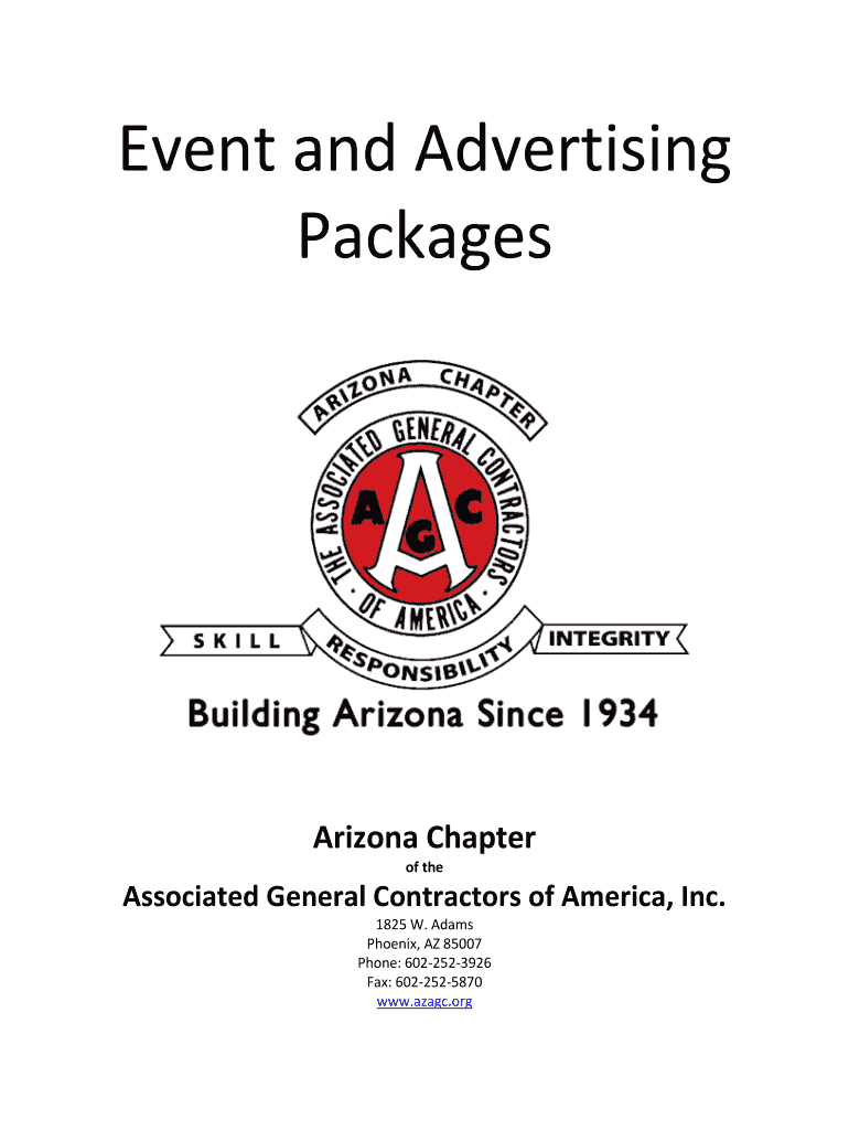 Event and Advertising Packages Arizona Chapter of associated General Contractors of America, Inc. 1825 W. Adams Phoenix, AZ 85007 Phone: 6022523926 Fax: 6022525870 www.azagc.orgRESERVEYOURAZAGC 2017EVENTSPONSORSHIPTODAY!