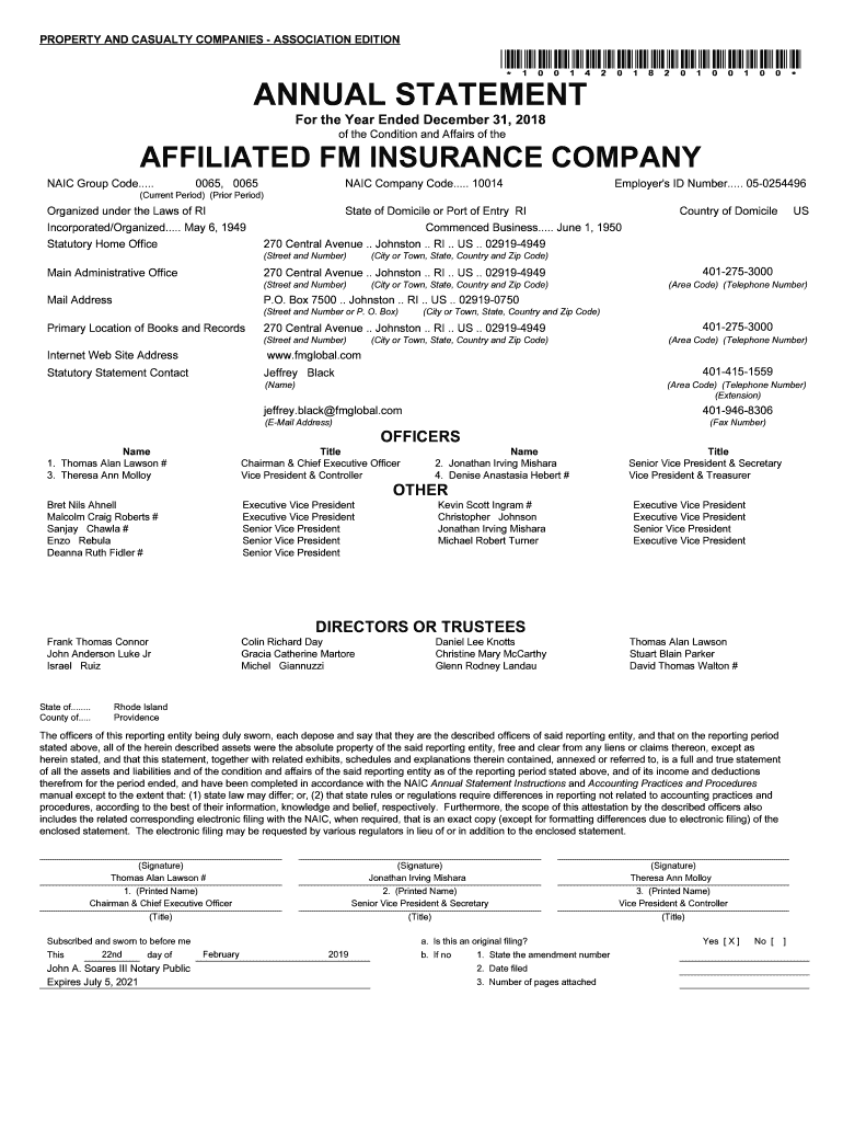 PROPERTY AND CASUALTY COMPANIES ASSOCIATION EDITION×10014201820100100×ANNUAL STATEMENT For the Year Ended December 31, 2018, of the Condition and Affairs of affiliated FM INSURANCE COMPANY NAIL