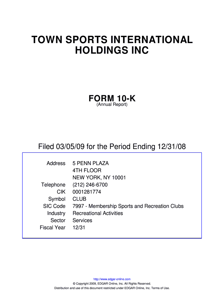 TOWN SPORTS INTERNATIONAL HOLDINGS INFORM 10K (Annual Report)Filed 03/05/09 for the Period Ending 12/31/08 AddressTelephone CIK Symbol SIC Code Industry Sector Fiscal Year5 PENN PLAZA 4TH FLOOR NEW