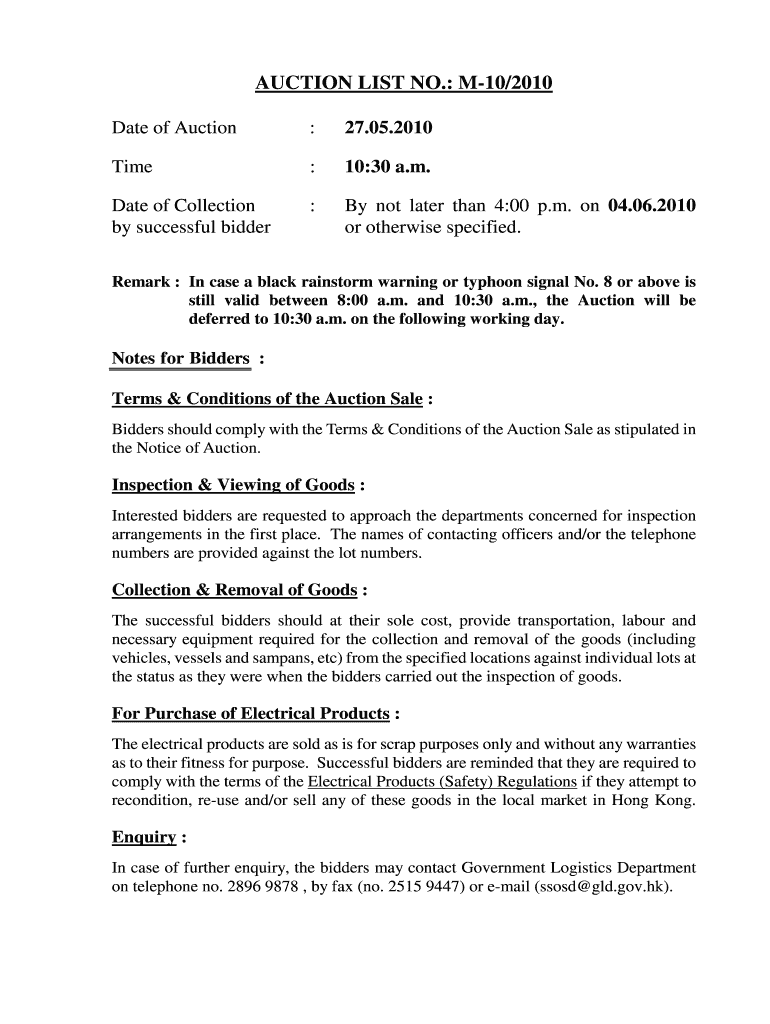 AUCTION LIST NO.: M10/2010 Date of Auction:27.05.2010Time:10:30 a.m. Date of Collection by successful bidder:By not later than 4:00 p.m. on 04.06.2010 or otherwise specified. Remark : In case a black