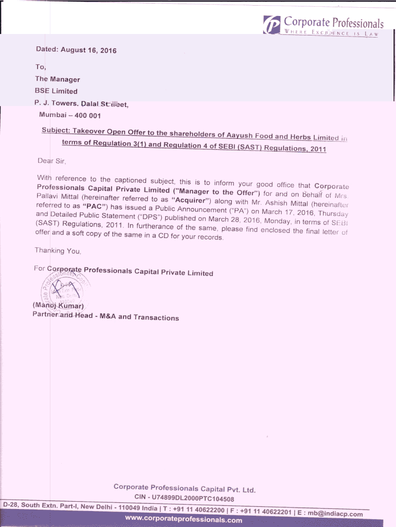 LETTER OF OFFER THIS DOCUMENT IS IMPORTANT AND REQUIRES YOUR IMMEDIATE ATTENTION This LOF is sent to you as a shareholder(s) of Aarush Food and Herbs Limited. If you require any clarifications about