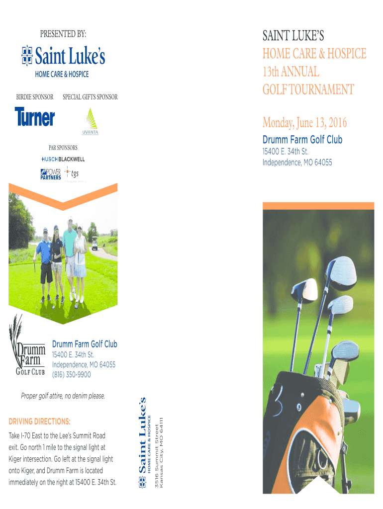SAINT LAKES HOME CARE & HOSPICE 13th ANNUAL Saint Luke's GOLF TOURNAMENTPRESENTED BY:BIRDIE SPONSORHome Care & Hospice Golf June Tournament Monday, 13, 2016SPECIAL GIFTS SPONSORDrumm Farm Golf Club