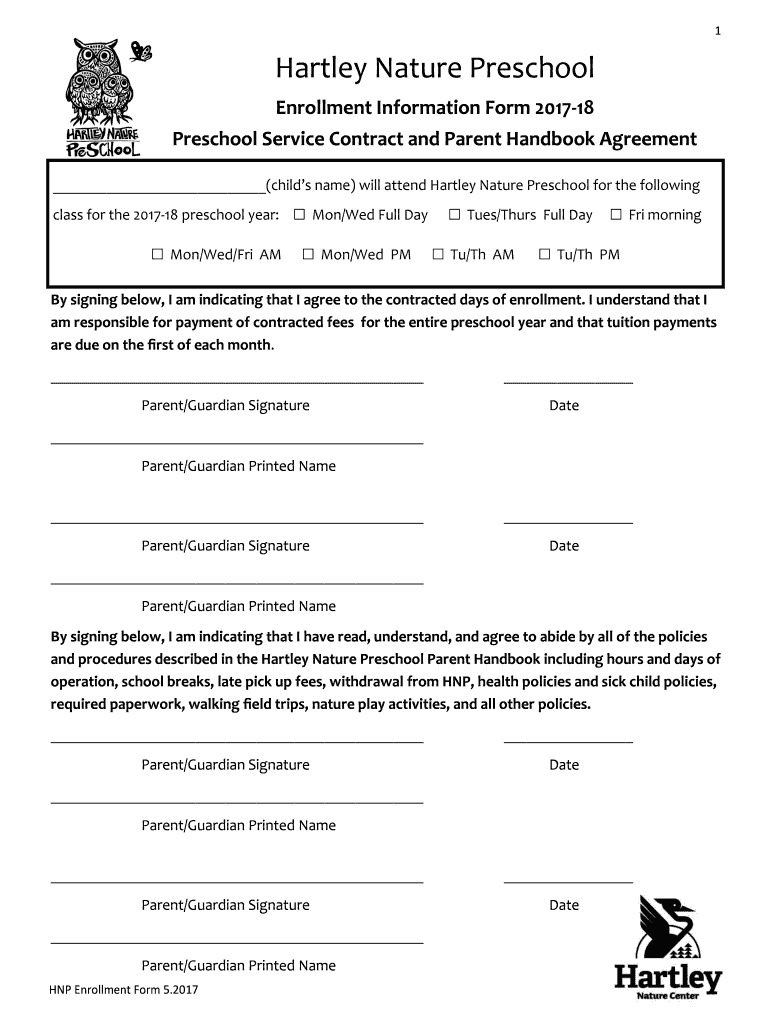 1Hartley Nature Preschool Enrollment Information Form 201718 Preschool Service Contract and Parent Handbook Agreement (children name) will attend Hartley Nature Preschool for the following class for