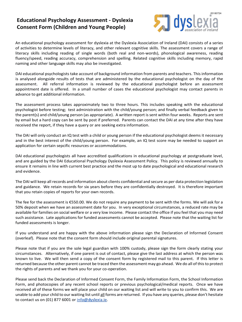 20180724Educational Psychology Assessment Dyslexia Consent Form (Children and Young People) An educational psychology assessment for dyslexia at the Dyslexia Association of Ireland (DAI) consists