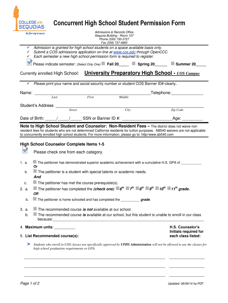The Concurrent High School Student Permission Form must be completed and submitted each semester before enrolling in courses. Check specific enrollment deadlines provided by the College of the Sequoias.