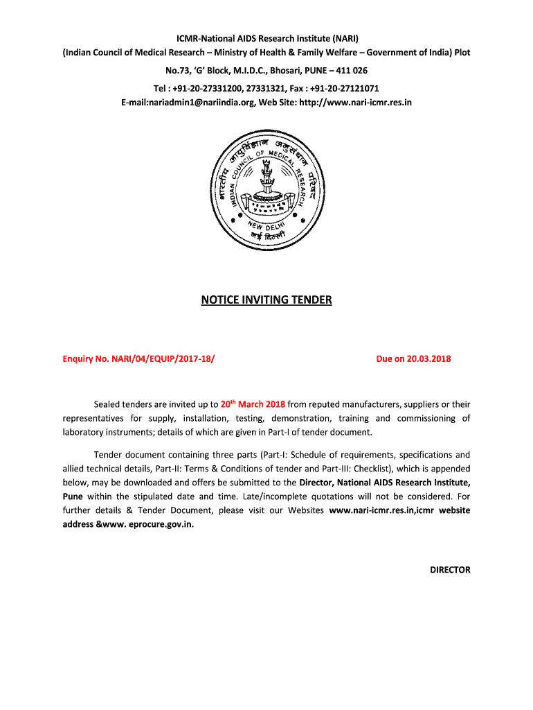 International AIDS Research Institute (NAZI) (Indian Council of Medical Research Ministry of Health & Family Welfare Government of India) Plot No.73, G Block, M.I.D.C., Board, PUNE 411 026 Tel : +912027331200,