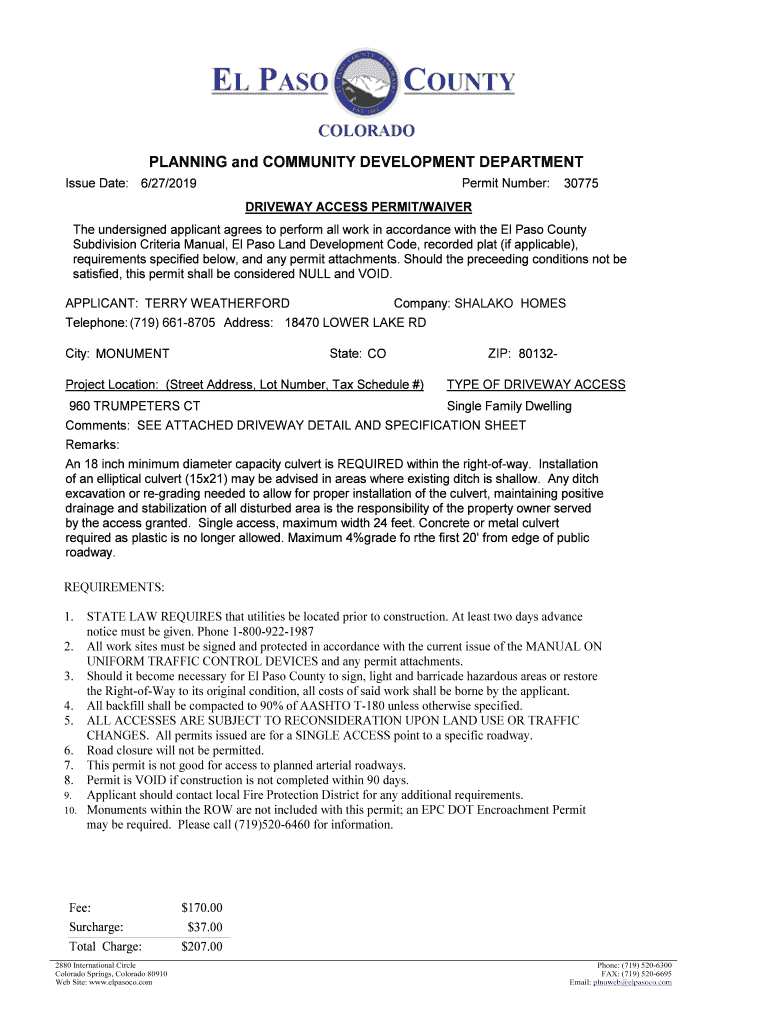 Issue Date: 6/27/2019Permit Number:30775DRIVEWAY ACCESS PERMIT/WAIVER