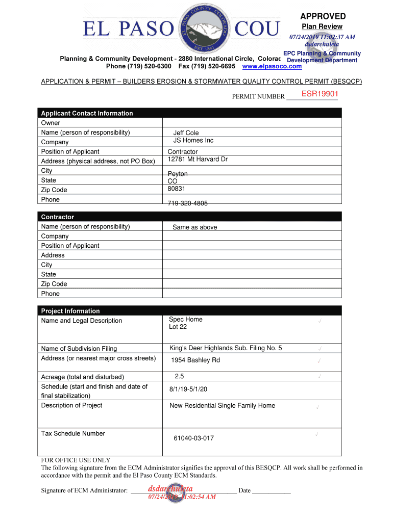 APPROVED Plan Review 07/24/2019 11:02:37 AM dsdarchuleta EPC Planning & CommunityPlanning & Community Development 2880 International Circle, Colorado Development Springs, Department 80910 Phone (719)