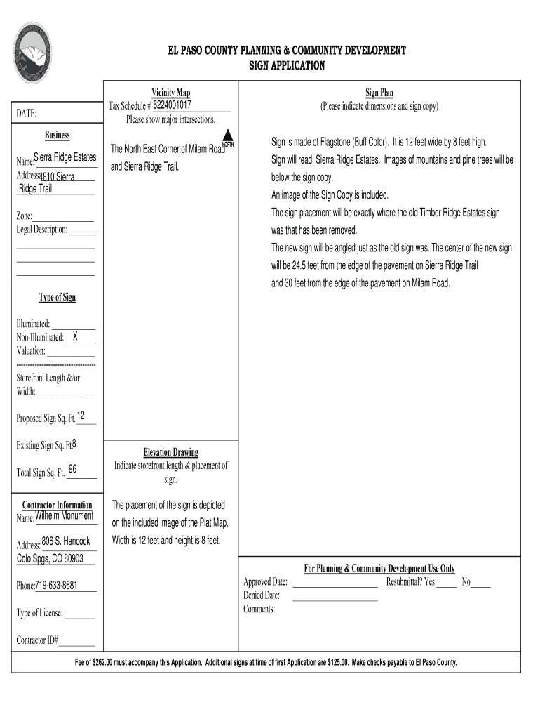 EL PASO COUNTY PLANNING & COMMUNITY DEVELOPMENT SIGN APPLICATION Vicinity Map 6224001017 Tax Schedule # Please show major intersections.DATE:NBusinessRidge Estates Name:Sierra Address: 4810 Sierra