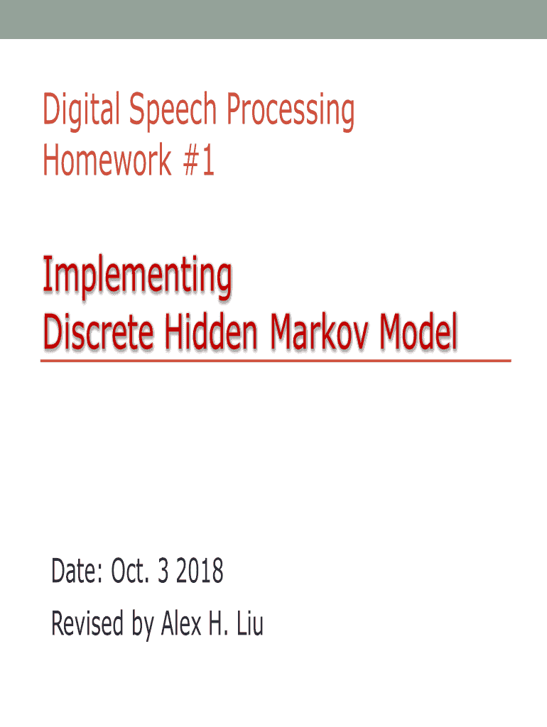 Digital Speech Processing Homework #1Implementing Discrete Hidden Markov Moderate: Oct. 3 2018 Revised by Alex H. Liu2Outline HMM in Speech Recognition Problems of HMM Training Testing Homework File