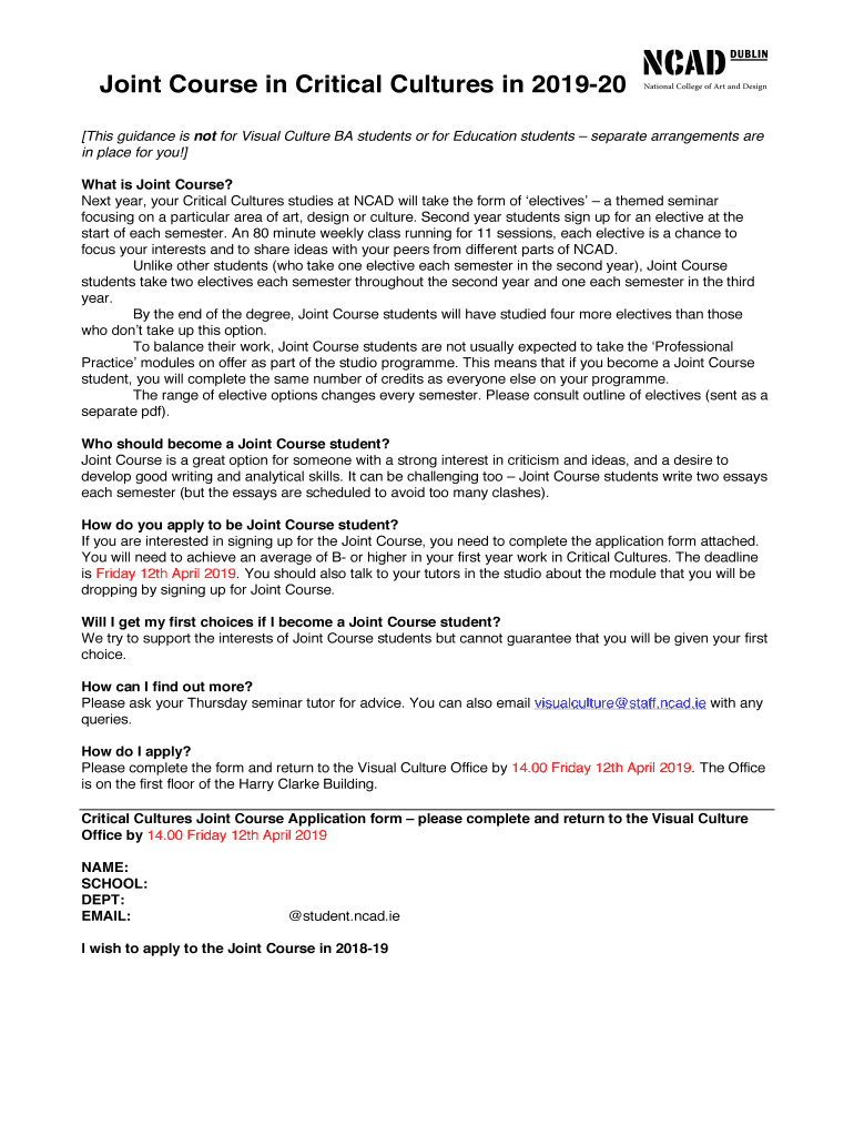 Joint Course in Critical Cultures in 201920 This guidance is not for Visual Culture BA students or for Education students separate arrangements are in place for you! What is Joint Course? Next year,