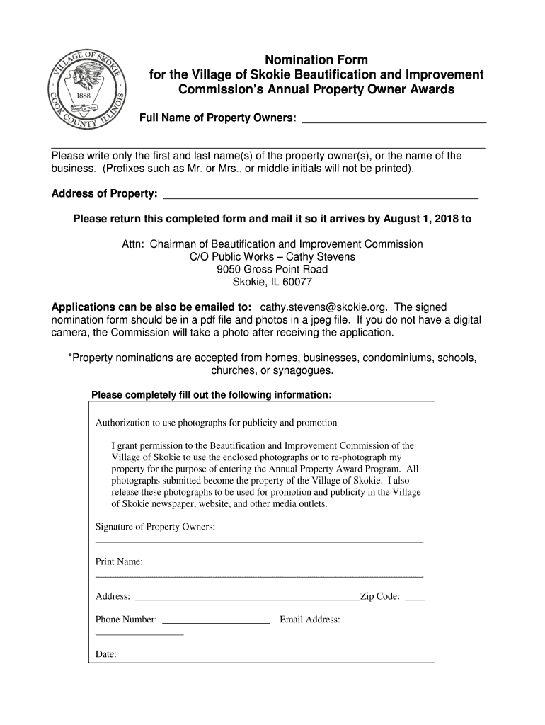 Nomination Form for the Village of Skokie Beautification and Improvement Commissions Annual Property Owner Awards Full Name of Property Owners: Please write only the first and last name(s) of the