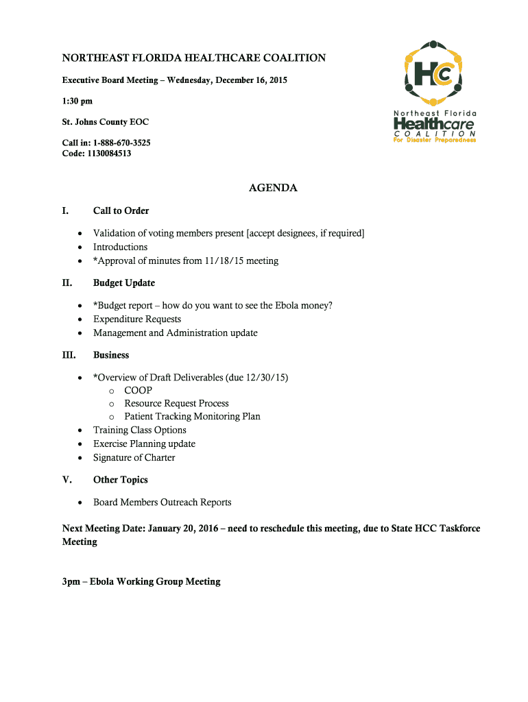 NORTHEAST FLORIDA HEALTHCARE COALITION Executive Board Meeting Wednesday, December 16, 2015 1:30 pm St. Johns County EOC Call in: 18886703525 Code: 1130084513AGENDA I. Call to Order II. Validation